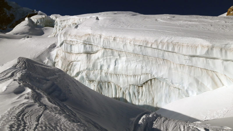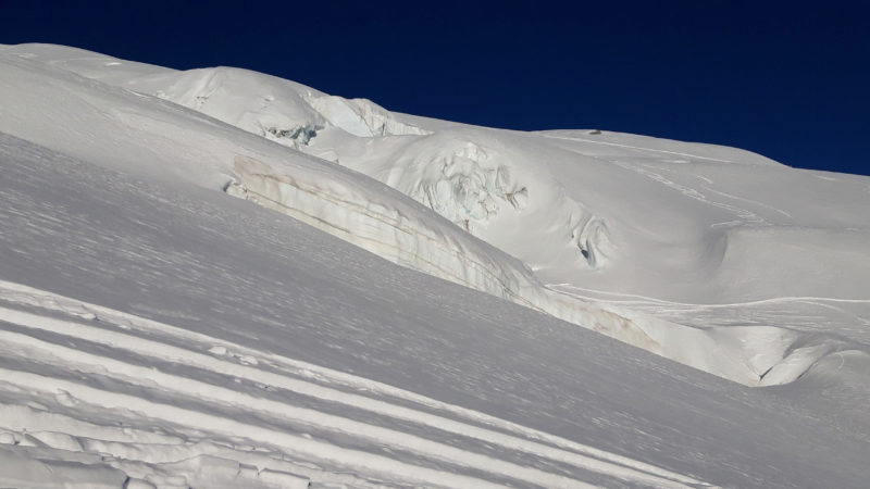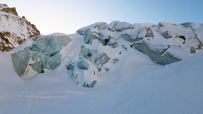 This state of wonder was interrupted by a short yet tricky icy ridge requiring us to strap our crampons on, attach our skis onto our bags, and hold the ice axes ready. After feeling like tightrope walkers while descending it, we put our skis on at the bottom. Around us, there were just fields of white powder covering big glaciers. Only rare ski tracks slightly disturbed the virgin look. The sun had warmed up the snow a bit allowing us to comfortably ride on it which felt like sliding on melted butter. We had 1400 meters to go down, moving away from tourist areas, going deeper into the relative wilderness. My two more experienced friends were opening the way, cautious about me following the tracks they’d made. In fact, the tempting virgin snow on the edges often hid crevasses or seracs. While slaloming through these glacial wounds, holes and recesses, I kept focusing on my trajectory so as not to get swallowed in what appeared to me like the mountain’s bowels, even though controlling the skis became harder as we were heading to an icier part of the valley in the shadows.