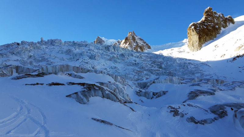 This very New Year’s Day, I was eager to start the spectacular day we planned during the previous eve. The weather conditions were perfect, and even though we hadn’t slept a lot, the 3 of us met precisely at 7.30 am to drive to Chamonix. After arriving at a slightly frozen parking place, we did a final check of our equipment while gathering it in our backpacks. Touring skis and shoes, crampons, ice axes, ropes, harnesses and avalanche transceiver kits for the essentials. Nothing was missing. The sun was already shining on the peaks and the temperature was fresh but not even cold. We were ready to get a bit of height on this special day.