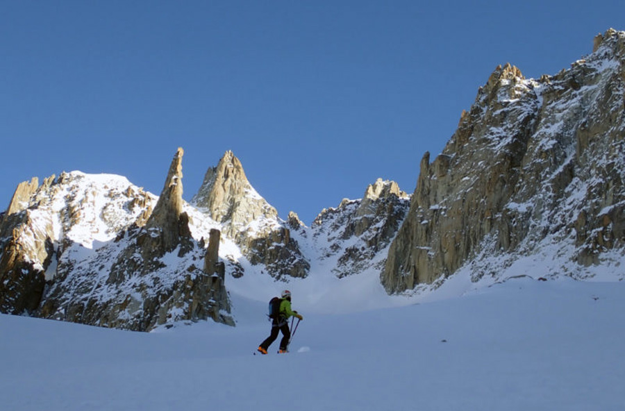 No time to get more contemplative. We had to get going, as the time was running out and we still had a while to go. I took a glance to Brèche de Puiseux, some 1000 meters higher. The last part looked super steep. It was a long and strenuous way to go and I wondered how we could ever reach it. We put our skins on the skis, and began climbing up. The Shhhh – Clac – Shhhh – Clac of my skis sliding on the snow were like a breathing rhythm. Regular, it was a familiar comforting sound in the desert-like surroundings. The mountain echo acknowledged our progression in this rock and ice sanctuary.
