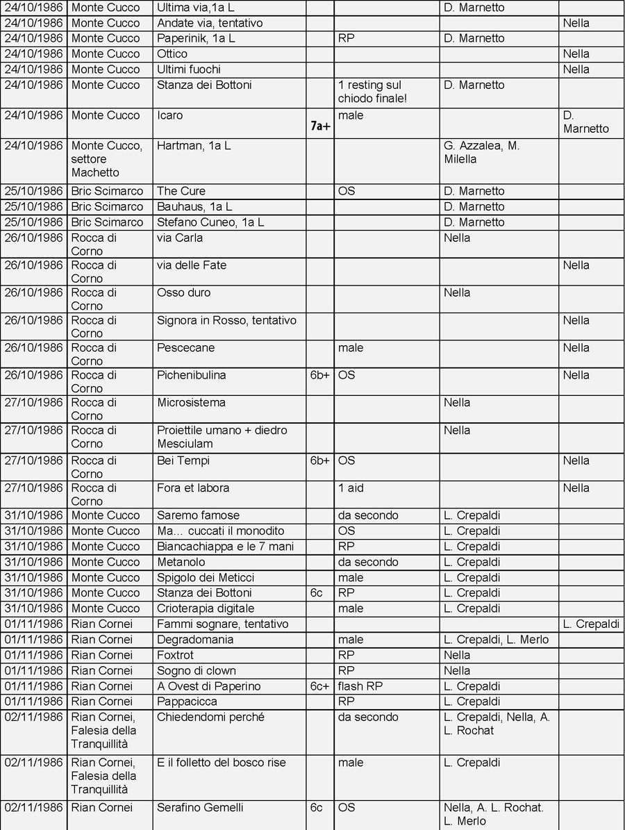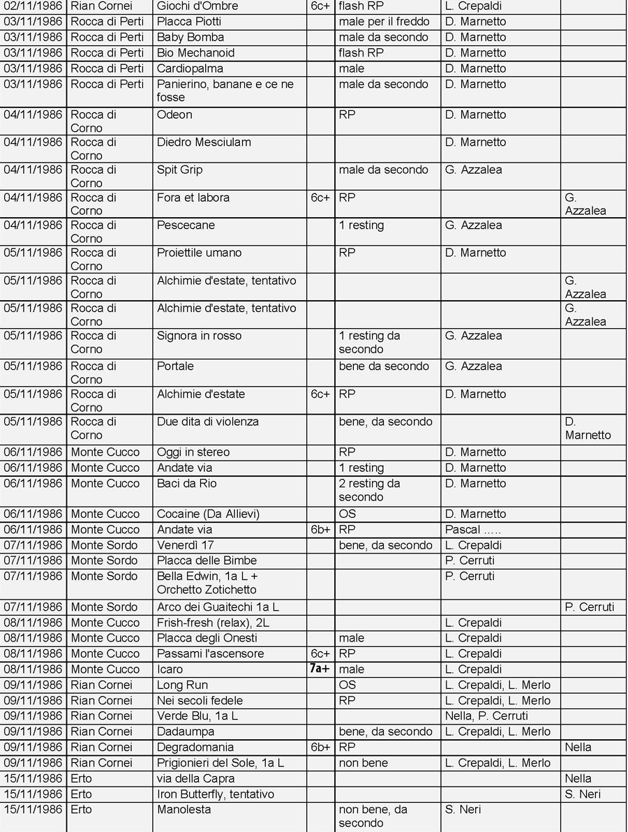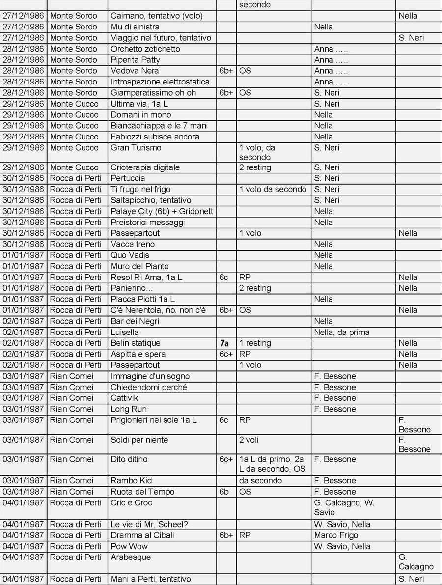 Nella seconda metà del 1986 eravamo dietro alla riedizione di Sul granito della Val Masino, di Giuseppe Miotti e Ludovico Mottarella, e alla pubblicazione di Arrampicate in Valle dell’Orco, di Maurizio Oviglia e Roberto Mochino, del mio Sentieri in Val di Fassa e Attraverso le Alpi Apuane, di Riccardo Pagliai e Roberto Marotta (quest’ultimo era il futuro ideatore della libreria Stella Alpina, a Firenze). Nelle edizioni non tascabili, lavoravamo alla prima edizione della guida d’arrampicata Finale, di Andrea Gallo e Giovanni Massari e alla guida Alle porte della Valtellina, di Miotti e Mottarella, in collaborazione con la Comunità montana di Morbegno.