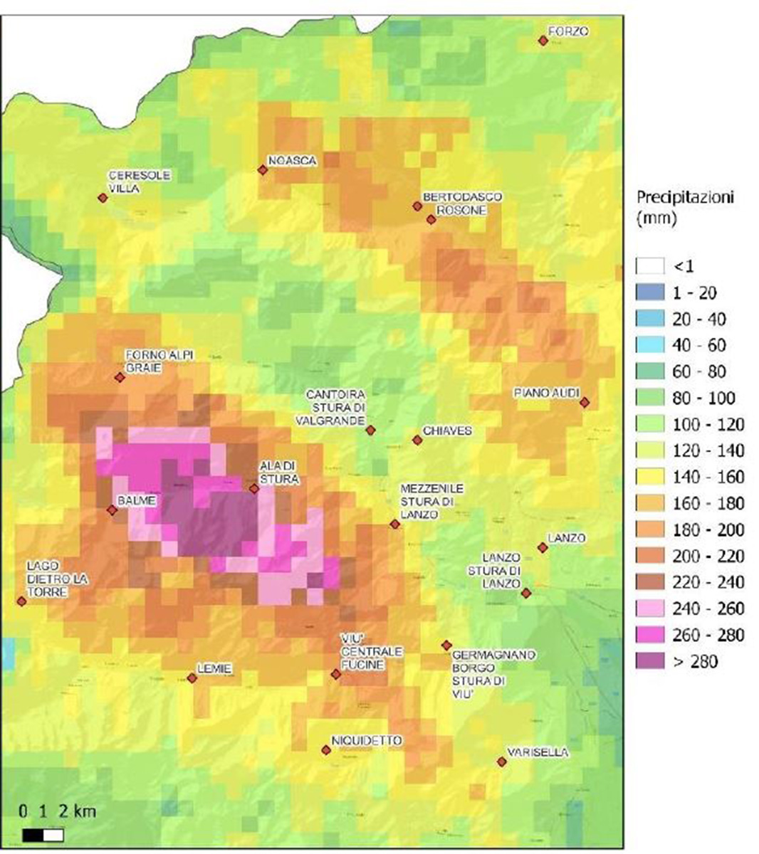 L’immagine sopra è tratta dal Rapporto Evento 4 – 5 settembre 2024 pubblicato da Arpa Piemonte. La zona del vallone di Sea è approssimativamente individuabile a sud-est di Forno Alpi Graie e la legenda ci dice che la pioggia cumulata del 4 – 5 settembre ammonta a circa 200 – 220 millimetri di pioggia equivalenti a 200 – 220 litri d’acqua per metro quadrato.