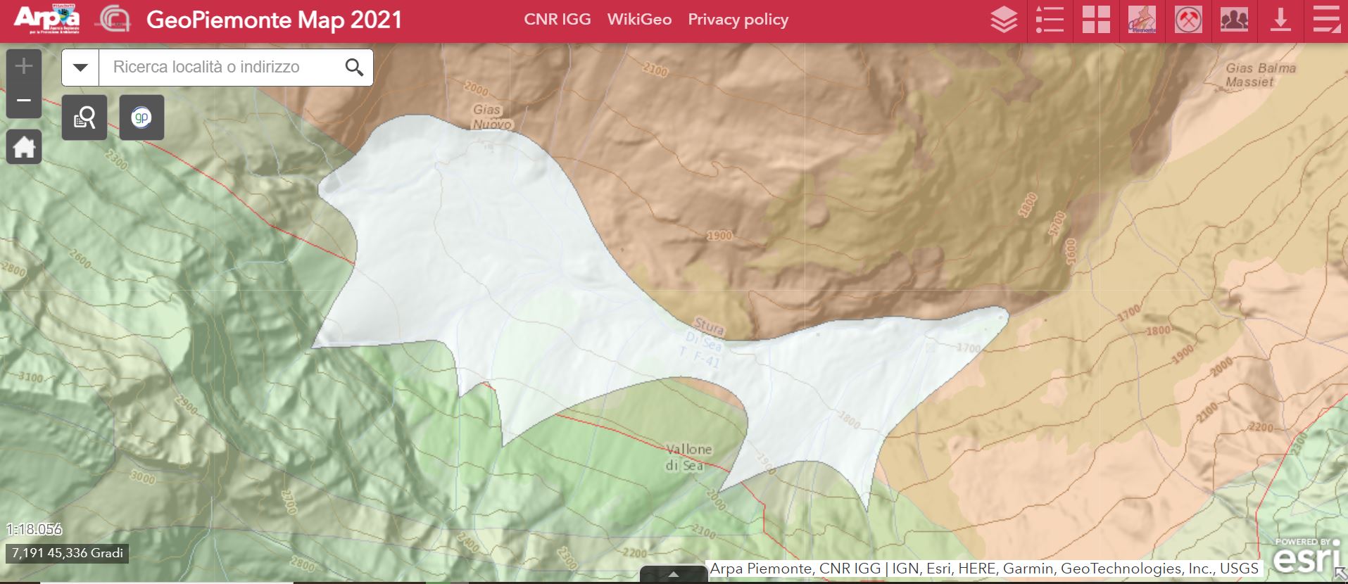 La Carta Geologica Interattiva del Piemonte – Progetto GeoPiemonte Map (consultabile online a questo link) evidenzia così l’area di Gias Nuovo nel vallone di Sea (v. immagine sotto).
