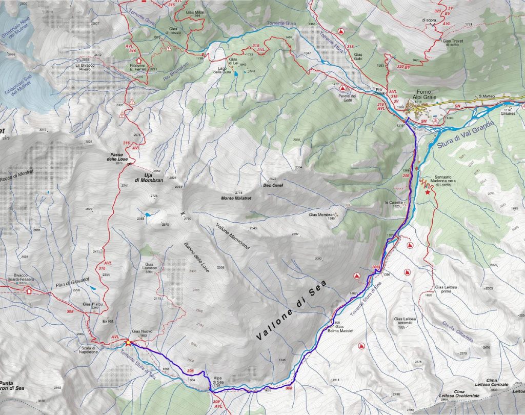 Ingrandendo la foto sopra è interessante notare anche la situazione di Gias Balma Massiet 1500 m che si incontra ad un’ora circa di marcia dalla partenza del sentiero 308, a Forno Alpi Graie. Qui dovrebbe arrivare la strada sterrata (in realtà definita “nuovo sentiero”) che ha in progetto il Comune di Groscavallo. Altro bersaglio? Sebbene edificato in epoche insospettabili, cosa possiamo aspettarci di fronte ai nubifragi sempre più “cattivi” (così Daniele Cat Berro su La Stampa del 3 luglio scorso) che si manifestano ai giorni nostri?