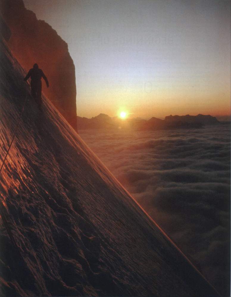 Lo osservo mentre stiamo tornando dalla festa dei cinquant’anni e mentre vedo che guarda dal finestrino del treno la “sua” parete nord, mi viene una domanda: “Ma cos’hanno visto per davvero quegli occhi? E quanto ha rivelato di ciò che ha visto? Perfino la parete scura che incombe lì fuori non ha una sola, singola superficie. Come la sua storia anch’essa è composta da molte superfici, da molte pareti per le quali le caratteristiche variano a seconda dell’angolo visivo. Alcune parti rimangono nell’ombra, che noi possiamo cercare di penetrare, magari usando una torcia elettrica, con la speranza di riuscire a illuminare i suoi misteri, ma con il serio rischio di creare nuove ombre. Apparentemente nulla distingue Votteler e i suoi amici dagli altri sciatori e turisti con i quali condivide lo scompartimento. Stessi abiti a colori sgargianti, stessa attrezzatura nuova. Hanno l’aspetto di persone normali, non fosse che cinquant’anni fa hanno fatto qualcosa di davvero straordinario.