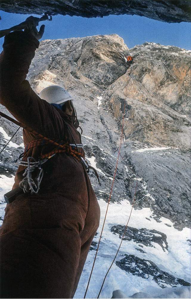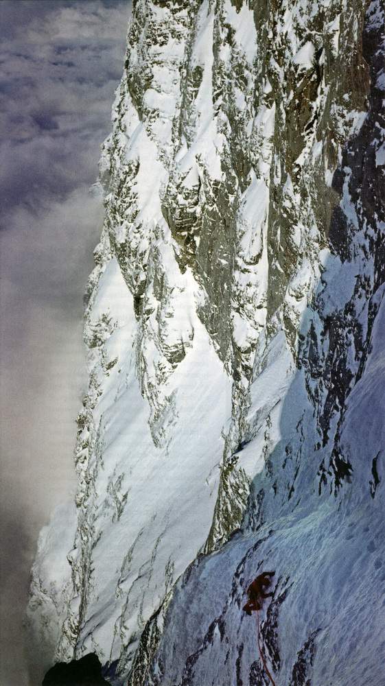 Indipendentemente dalle circostanze precedenti, comunque, “Carletto Catastrofe” Golikow si mostrò all’altezza della sua reputazione venendo fuori da un colatoio salendo in spaccata e usando un solo chiodo per tutto il tiro. Quando alla fine riuscì a issarsi sopra una pila di blocchi di ghiaccio staccati per arrivare sulla sommità del Pilastro centrale, quello che sembrava essere il passaggio chiave della via era ormai alle loro spalle. Quando Kor passò oltre un tetto sporgente, la maggior parte della parete nord sembrava sprofondare sotto di loro, con gli ampi lastroni dei nevai e le ripidissime cenge rocciose compresse in linee intrecciate di fili bianchi e neri.