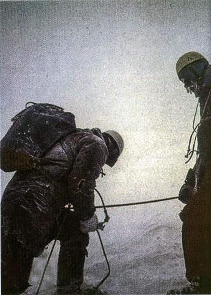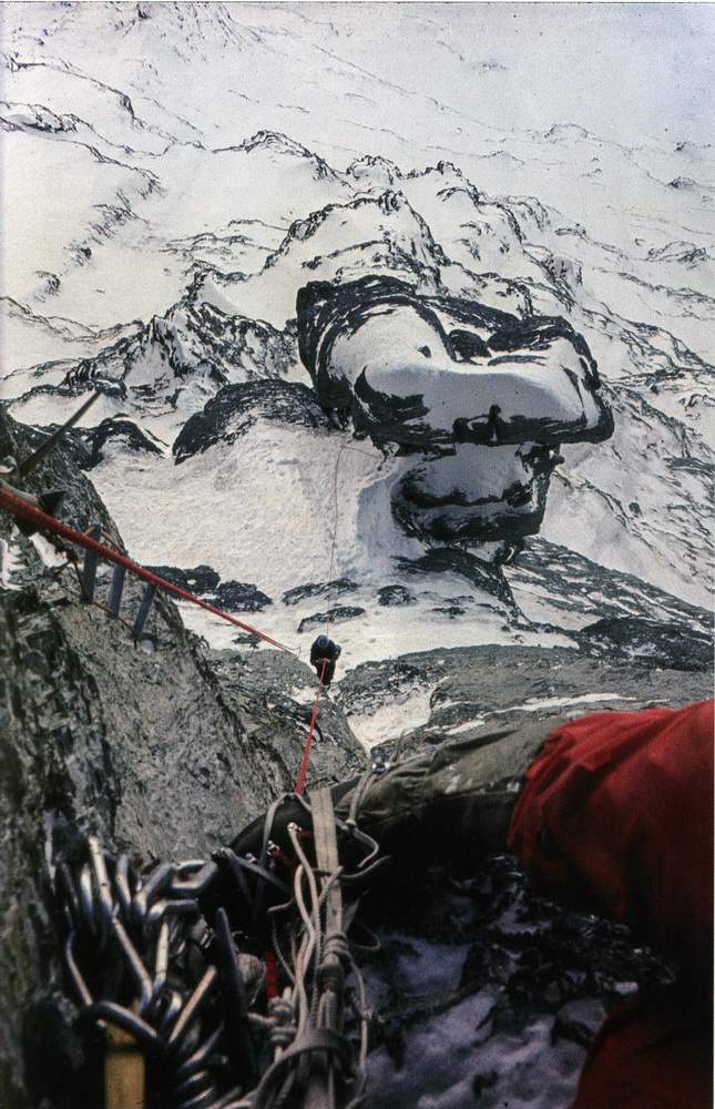 Il vento si intensificò fino a diventare quasi un uragano. Il ghiaccio si attaccò alla faccia andando a creargli una maschera mentre saliva barcollante lungo un ghiaione a ottanta gradi – “niente roccia, solo detriti di tutti i calibri possibili”. Invisibile nella luce accecante sentiva la sua solitudine diventare sempre più surreale e oppressiva, fino a fargli passare per la testa che i suoi compagni avessero smesso di assicurarlo e lo avessero abbandonato sulla parete. Per ben cinque volte urlò alla radio “Siamo all’inizio del Nevaio Sommitale”. Poi, quando Lehne si staccò dalla corda per risistemare la sosta e far salire i suoi compagni, un cuneo di legno che aveva piazzato venne fuori e per poco non si fece un volo con conseguenze fatali.