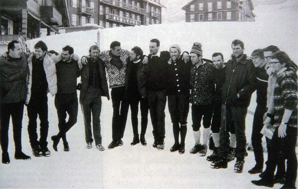 La squadra di vetta sul versante ovest (via di discesa): Jörg Lehne, Günther Strobel, Roland Votteler, Dougal Haston e Sigi Hupfauer. Karl Golikow, Günter Schnaidt e Rolf Rosenzopf, nonché Bonington e altri due, erano andati a festeggiarli. Gli undici avevano passato una notte tra i crampi in una caverna scavata nel ghiaccio. “Non esistevano barriere nazionali lì” – scrisse Haston in Eiger Direct – “eravamo uniti dallo spirito della scalata estrema”. Foto: Chris Bonington.