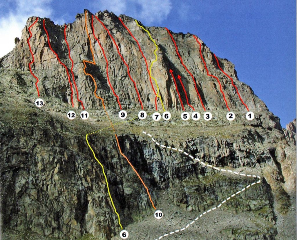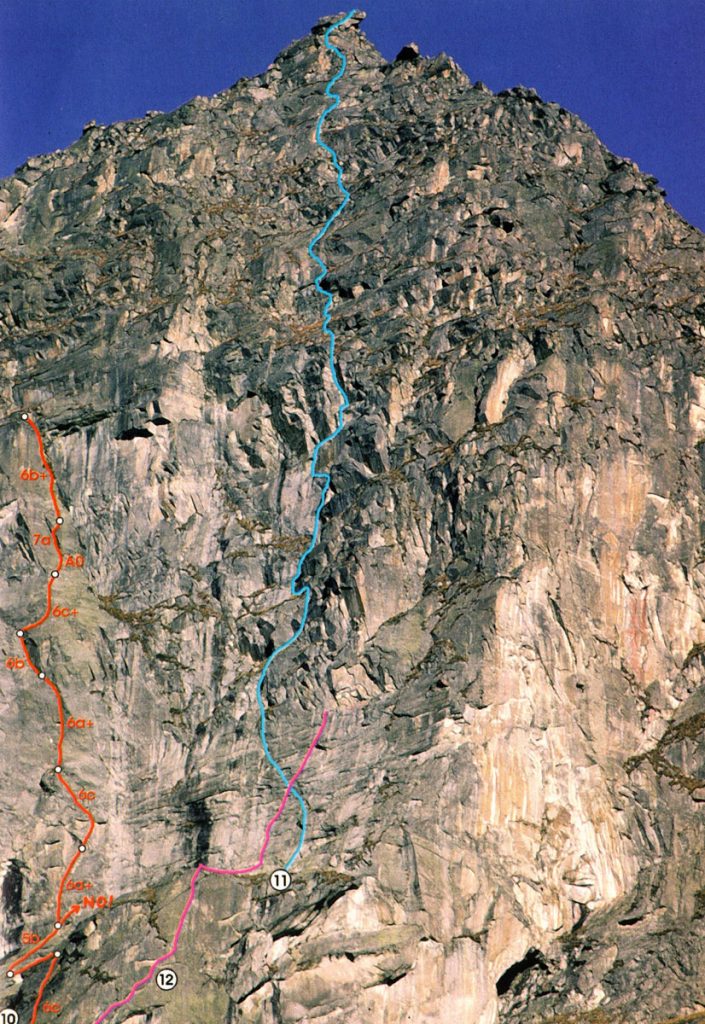 Per concludere questa breve puntata nel vallone di Noaschetta voglio ancora citare una via che ricordo come molto bella, quella realizzata con Laura Ferrero e Franco Ribetti sulla Torre Superiore del Blanc Giuir il 12 giugno 1982, via che oggi sarà sicuramente percorribile in “libera” dove noi usammo le staffe.