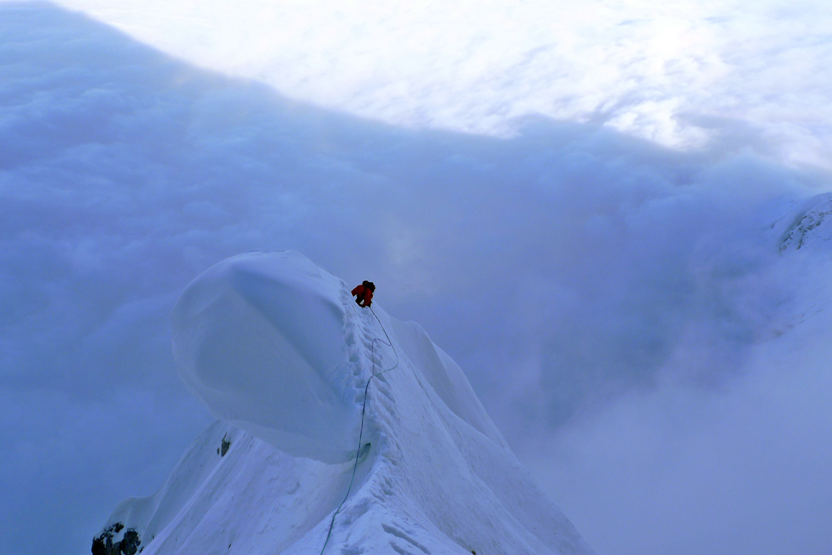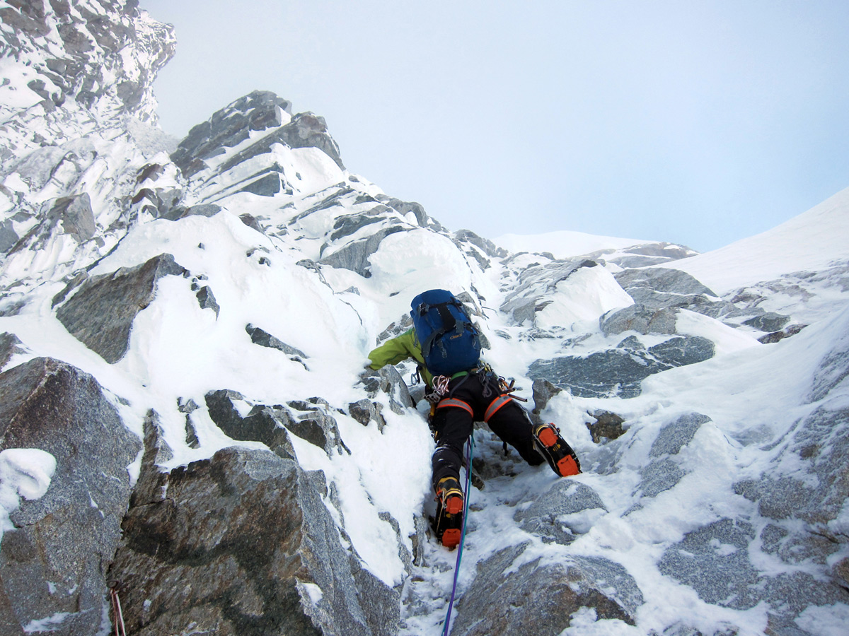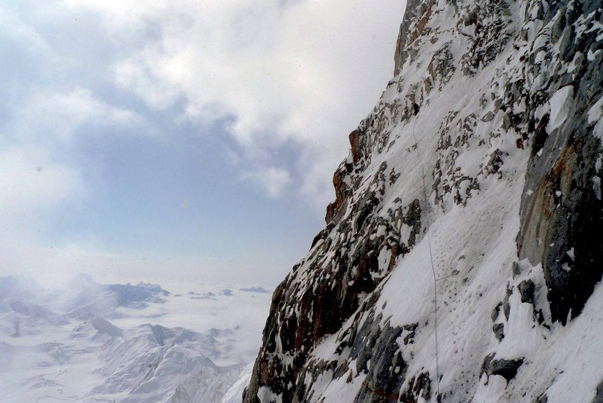 La prima metà della Cassin è stata molto divertente, c’erano tratti di arrampicata tecnica. È stato intenso e tonificante: andare “sciolti” richiedeva concentrazione. Poter muoversi con uno zaino molto leggero e senza attrezzatura su una grande montagna è puro piacere per la libertà di movimento che consente, molto più della semplice velocità o della caccia al record (speravamo di battere la salita di 15 ore di Mugs Stump, 1991). Ma ad un certo punto sopra la cresta del Knife Edge ha iniziato a nevicare, cosa che ci ha rallentato notevolmente. La metà superiore della salita era costituita da facili pendii di neve e ghiaccio, il che sarebbe andato bene se il tempo fosse stato bello. Ma sguazzare nella neve fresca e profonda non era divertente. Abbiamo raggiunto la vetta completamente esausti 17 ore dopo aver lasciato la conca dell’attacco.