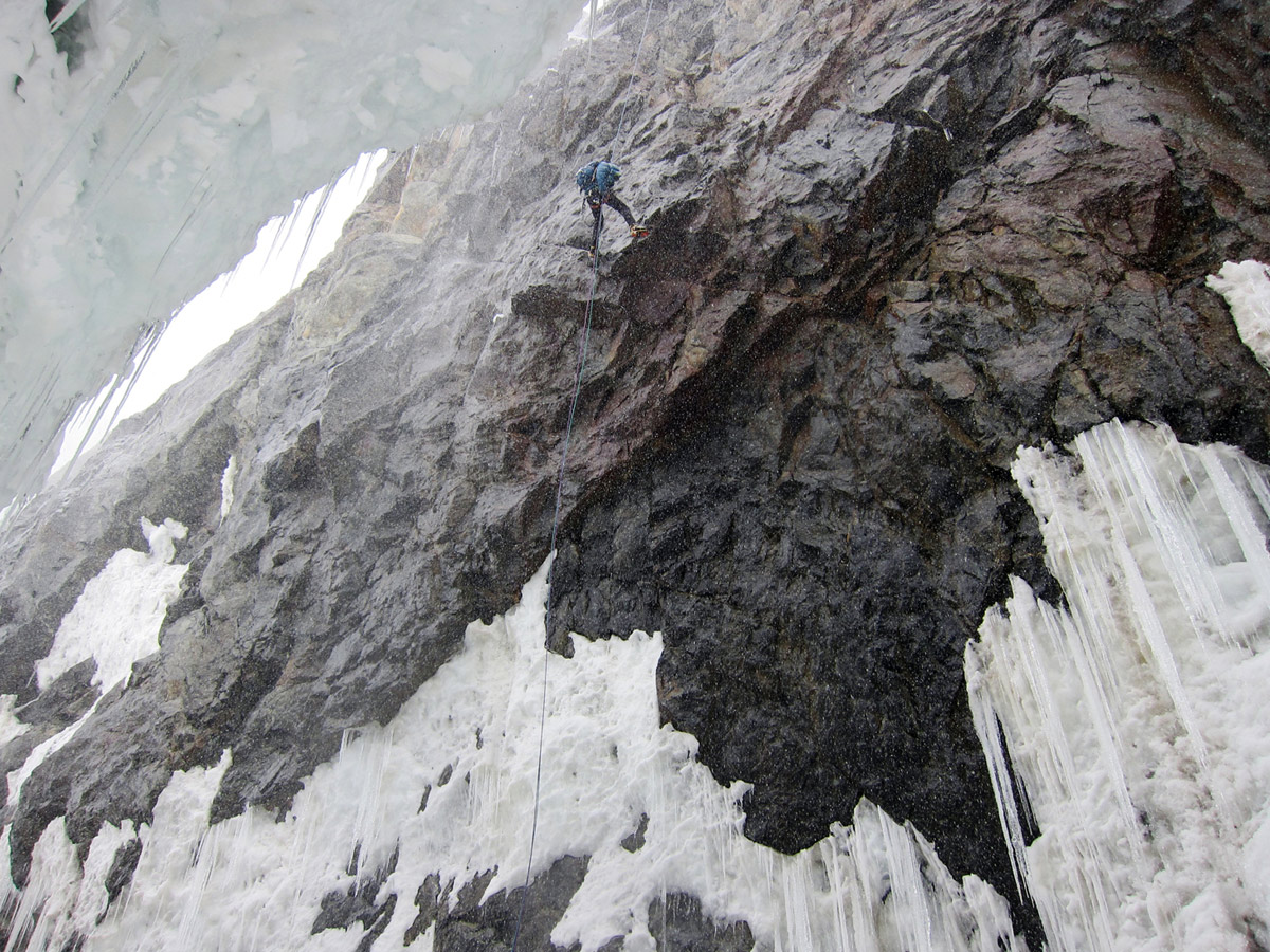 Alla fine della rampa una divertente arrampicata mista mi ha portato su neve ripida, davvero ripida alla fine. Questa parte avrebbe dovuto essere con la guida di Colin: è bravo in questo. E’ un fatto che a lui piace, mentre a me no. Ero quasi alla fine, quando ho avuto una sensazione inquietante e ho sbirciato oltre il bordo a destra. Sì, era proprio come temevo: stavo per salire su un fungo strapiombante grosso quanto un’auto. Il mio cuore batteva forte e ho subito provato a spostarmi a sinistra. Non c’era protezione. Il mio ultimo chiodo era a 20 metri di distanza quando finalmente ho potuto costruire una sosta su ghiaccio solido. Guardando in basso sono rimasto sbalordito dalla precaria formazione di neve. Sembrava incernierata in 30 cm di neve a debole coesione; le mie tracce tagliavano proprio dove prima o poi ci sarebbe stata la frattura.