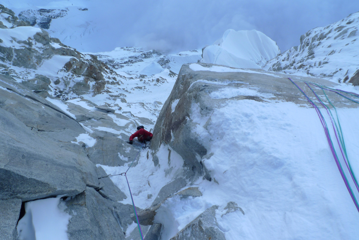 Uscivo spesso per dare un’occhiata al tempo, temendo di perdere l’eventuale schiarita. Dopo 12 ore il nuovo giorno ha portato un po’ di visibilità, appena sufficiente per orientarci lungo la cresta. Ormai avevamo deciso di provare a scendere lungo la via originale della cresta nord-est, aperta nel 1966 da un team giapponese. Non veniva scalato da decenni, ma era più riparato dal vento e sembrava l’unica opzione fattibile.