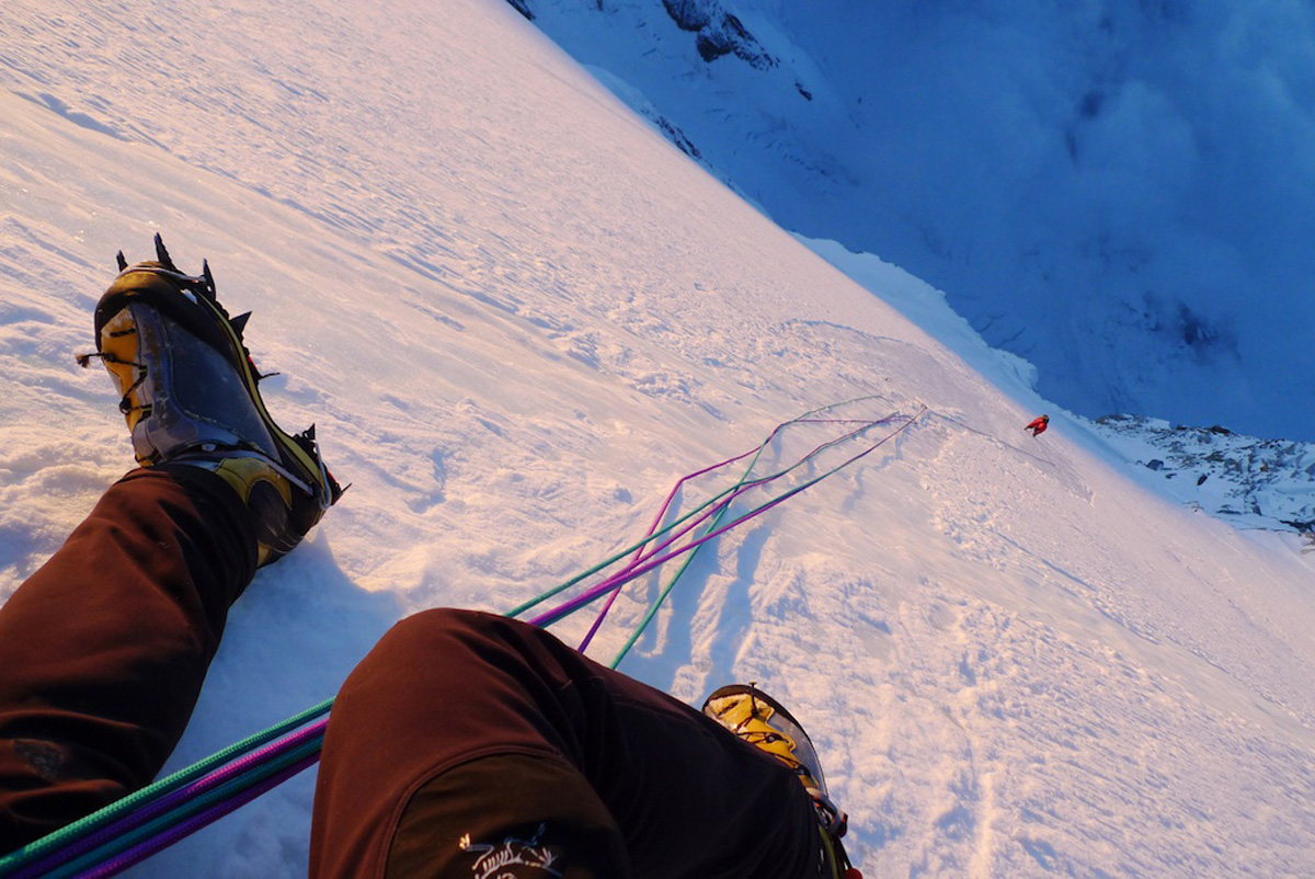 I primi raggi del sole mattutino ci colpiscono circa 200 metri sotto la cresta. Eravamo completamente disfatti quando finalmente abbiamo terminato l’ultimo tiro di simul-arrampicata e abbiamo potuto sdraiarci sulla cresta. Mi sono messo una fettuccia in vita e l’ho agganciata al mio attrezzo per poter dormire un paio di minuti aspettando che la neve si smollasse un po’.