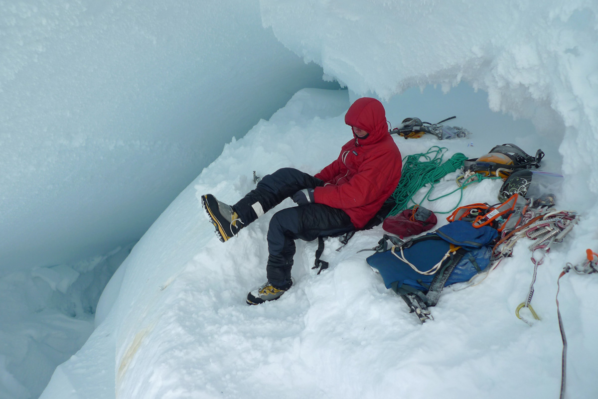Dopo due tentativi di proseguire lungo la cresta abbiamo dovuto ripiegare nuovamente nel crepaccio. Era impossibile andare avanti. Stranamente ci sentivamo piuttosto tranquilli. Le mie origini norvegesi, piene di montagne fredde, mi hanno permesso di accettare il fatto che dovevamo solo aspettare, anche se non eravamo attrezzati. Prima o poi ci sarebbe stata una piccola pausa nella tempesta e avremmo avuto visibilità appena sufficiente per ripartire. All’interno si alternavano piccole battute e grandi preoccupazioni. La maggior parte del tempo dovevamo lavorare duro per non perdere calore. Non potevamo sdraiarci; invece piegavamo le ginocchia e facevamo oscillare le braccia in infinite ripetizioni.