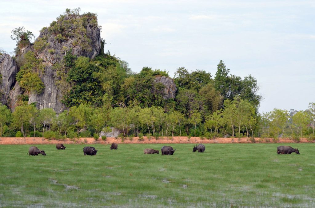 Le suole furono attaccate in qualche modo con dello spago e proseguimmo il nostro viaggio fino quasi al confine con il Vietnam, dove il traffico di merci trasportate in modo pericoloso superava ogni limite. Poi, attraverso immense risaie popolate dalle onnipresenti bufale e sfiorando qualche pagoda, tutte nuove e prive di vero fascino al di là dei colori e delle forme, ci dirigemmo all’interno alla ricerca di un sito di arrampicata di cui avevo saputo su internet. Non per scalare (non avevamo portato alcun tipo di equipaggiamento) ma per vedere almeno che cosa poteva essere l’attrezzatura. Non che ci interessasse molto, tanto è vero che alla fine tralasciammo le ricerche, rinunciando davanti a un risalto che si affondava in uno stagno e preferimmo tornare sulla costa e a Kep.