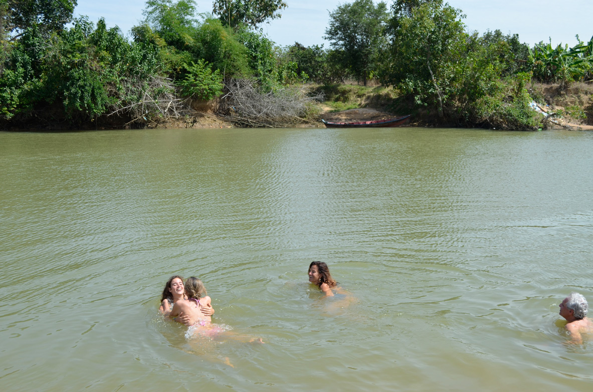 La prima parte della giornata fu dedicata ad un giro in barca sul maestoso fiume di Kampot, il Teuk Chhou. Guidati con professionalità dal sereno e tranquillo giovane svedese Bjorn, ne seguimmo il corso per parecchi chilometri, addentrandoci sempre di più in quella che ci sembrava la vera Cambogia, lontana dal traffico e dalla costa. Osservare il paesaggio da un fiume era come guardare la campagna che scorre attraversandola su un treno. Le curiosità si assommavano e la quiete del viaggio favoriva le domande a Bjorn che rispondeva sempre dando prova di conoscere quei posti quasi come un nativo. Faceva assai caldo e, a dispetto della lieve brezza provocata dal nostro moto, sudavamo copiosamente. Ci fermammo perciò per un veloce spuntino su una graziosa spiaggia sabbiosa: venne spontanea a più d’uno la voglia di un bagno.