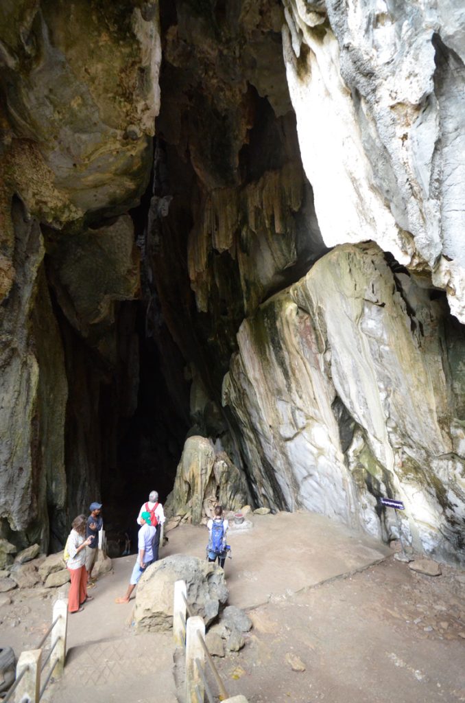 Una scalinata di 203 gradini, ben tenuta, risaliva il fianco della collina per poi scendere in un antro affascinante come una cattedrale gotica. Vedemmo subito la cosiddetta stalattite dell’elefante e la sagoma di un altro pachiderma riconoscibile sulla piatta parete di roccia sulla destra. C’erano due “camini” di roccia che svettavano verso il cielo, in parte coperti da fogliame di un verde rigoglioso. Si sentiva il brusio di una colonia di pipistrelli.