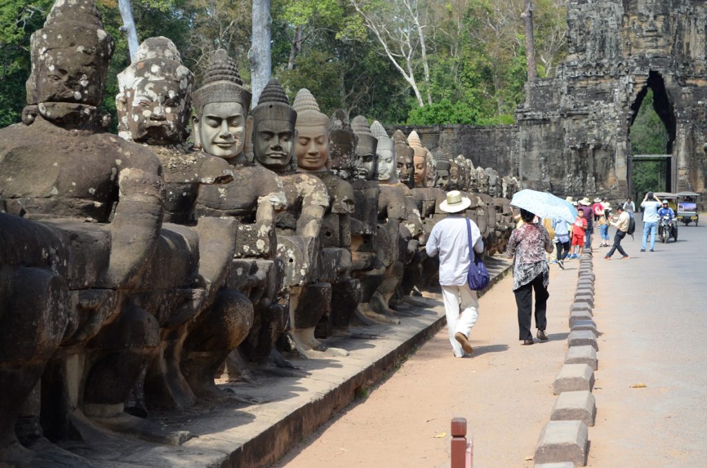 Questa sgradita coincidenza ci fece ancor più concentrare nella visita, che continuò per tutto il giorno, di Angkor Wat; ma la cavalcata continuò senza sconti anche a Bayon, Baphuon, Ta Nei, fino a Ta Prohm. In questi siti giganteschi, strapieni di cose da vedere, la folla cinese ci circondava di continuo. Per fare una foto erano estenuanti attese e goffe acrobazie. Devo riconoscere che la gente era abbastanza ordinata, rispettosa delle file e soprattutto decentemente silenziosa. Ma ciò non bastava a non fare apparire assurdo quel rivolgersi all’arte maestosa di quei siti come ad una torta di nozze da tagliare a fette. Tutti dovevano avere la loro parte, nessuno rinunciava al selfie obbligatorio, imperversava la prolunga del selfie stick, spinto commercialmente proprio da aziende cinesi. C’era un’infinità di chioschi che vendeva i peggiori souvenir di plastica. Gruppi di ragazze che cinguettavano a bassa voce tra di loro, bambini che si perdevano e piangevano, gente che si accasciava all’ombra di qualche muro, anziani in evidente difficoltà, padri che dietro ai loro occhialini leggevano le guide a mogli e figli attenti, guide cambogiane che gestivano gruppi anche di trenta o quaranta persone con consumata precisione. Per tutte quelle ore ci concedemmo solo delle pannocchie di granturco e qualche bibita. Alla sera eravamo davvero sfiniti, pure la nostra guida confessava di esserlo: ma non so quanta di quella bellezza abbia potuto rimanere dentro di noi.