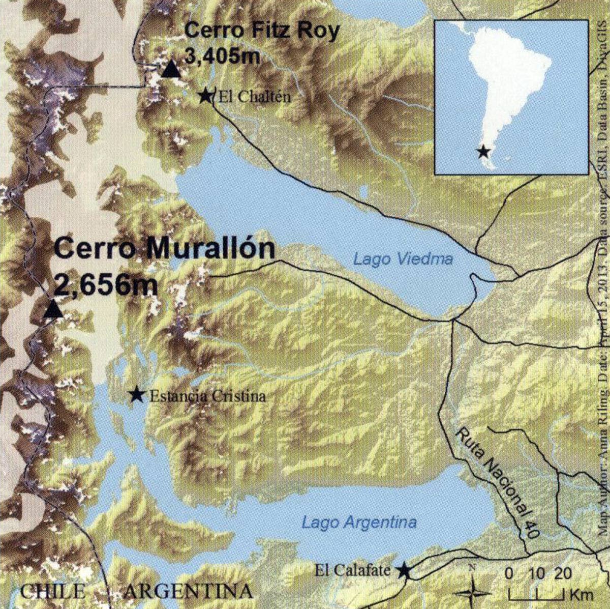 Il Murallón svetta sulla calotta glaciale della Patagonia a sud delle vette più frequentate del massiccio del Chaltén. Dal 1961, sono state scalate cinque vie sulla montagna e la vera vetta è stata raggiunta solo due o tre volte.