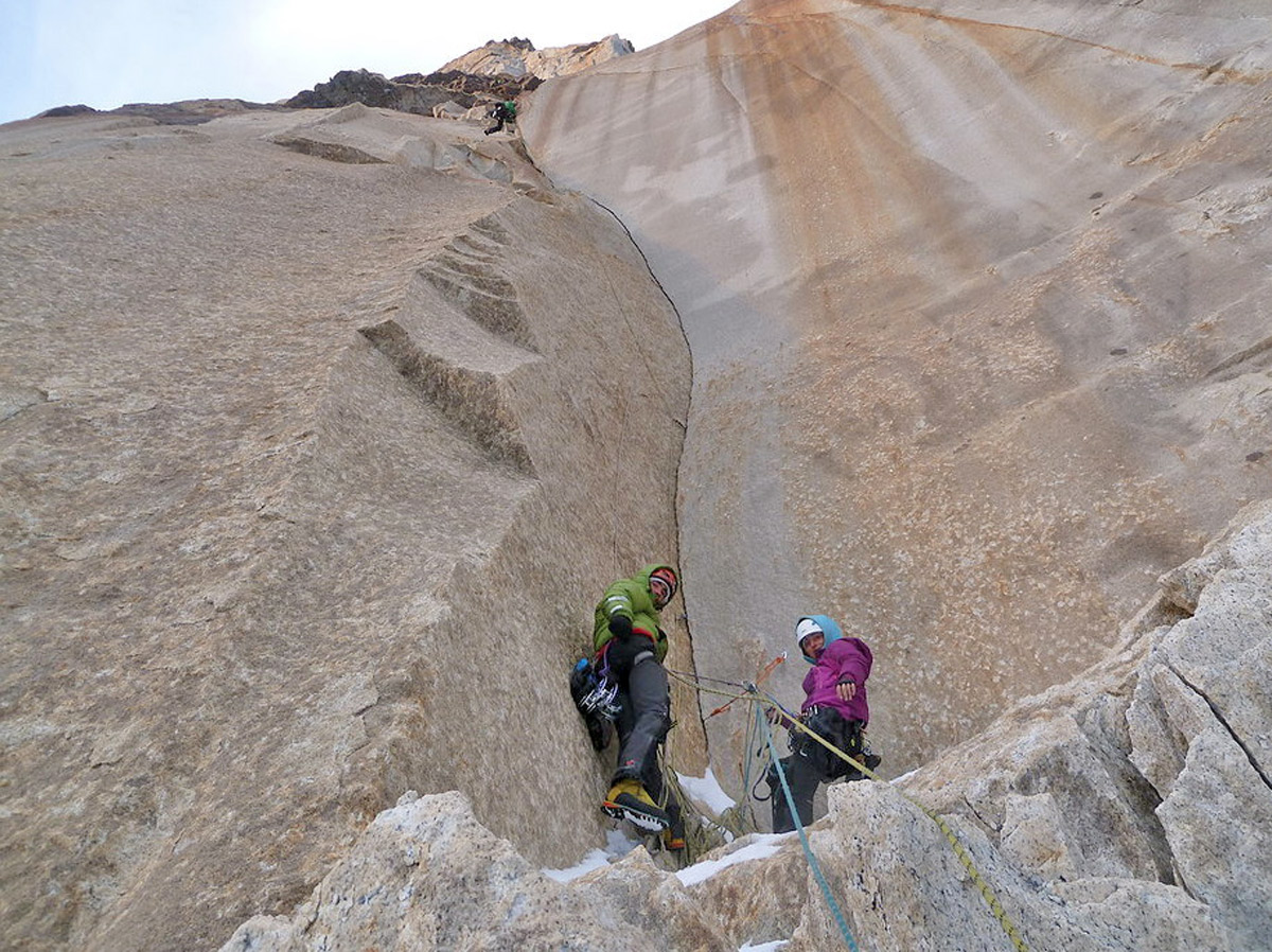 Due giorni di tempesta ci tengono chiusi nelle tende. Il terzo giorno ci svegliamo con il cielo azzurro e finalmente possiamo indossare le scarpette da arrampicata. Essendo il mio compleanno il 15 novembre, la squadra decide gentilmente di lasciarmi andare per primo. Le fessure variano di misura, da quelle da dita all’off-width, e sono pulite e continue. Siamo molto impazienti e facciamo qualche stupido errore: qualcuno perde una scarpetta da arrampicata e un altro dimentica il casco. Anticipando la nostra discesa, piantiamo qualche chiodo e spit. Mettiamo su 300 metri di corde fisse (tutte quelle che abbiamo) e torniamo giù.