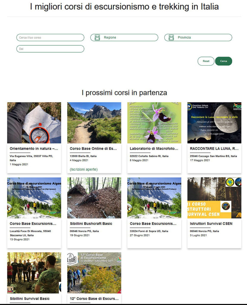 La sezione “corsi” (anch’essa comunque dotata di funzione di ricerca per luogo, data, tipologia, ecc.) mostra titolo e foto dei corsi del momento. Si va dalla macrofotografia al survival, dall’escursionismo basic all’orienteering, ecc.