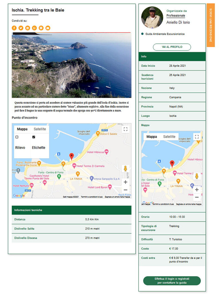 I risultati della ricerca appaiono elencati ordinatamente in pagine da 12, con nome e foto. Cliccando su questi si apre la scheda relativa, dove a una nota descrittiva del percorso seguono tutti i dati numerici, orario, lunghezza, dislivello, equipaggiamento consigliato. Nella colonna di destra appare subito il nome e cognome della “guida” proponente, una lista di altre necessarie informazioni (come ad esempio i costi che talvolta sono indicati e talvolta “da concordare”) e infine lo spazio per contattare direttamente l’accompagnatore.