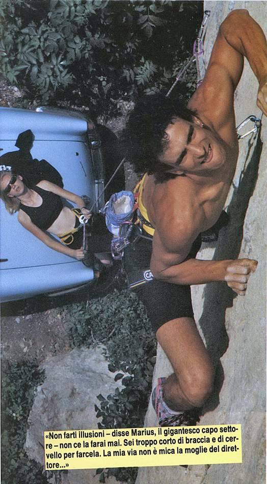 Intanto F.J., che era nel settore di Neon, non staccava gli occhi dall’ultimo tratto di parete. «Non farti illusioni» disse Marius, il gigantesco capo settore. «Non ce la farai mai. Sei troppo corto di braccia e di cervello per farcela. La mia via non è mica la moglie del direttore» aggiunse, e scoppiò a ridere scoprendo gli enormi denti. Poi, dopo essersi slegato, il secondino norvegese andò a digitare sul graphic-computer gli ultimi movimenti che aveva automatizzato. F.J. si guardò alle spalle, estrasse il suo diabolico cliff-hanger e corse giù fino alla cengia. Infilò al polso l’uncino che Patrick gli aveva costruito ricavandolo dalla tripla lamina in acciaio di un bizzarro paio di pedule rubate al museo del carcere. Il tiro iniziava con uno jeté. F.J. si rannicchiò e lanciò. Rimase appeso senza difficoltà alla grande manetta a mezza luna. Raccolse i piedi e li mise in aderenza. Monodito sinistro, su a prendere una reglette obliqua, incrocio di piedi, foot-hook, mano-piede nello stesso buco e uscita in leggero strapiombo. «Ehi, Marius, chi diavolo c’è sulla tua nuova via?». Il capo settore sollevò la testa e corse alla base dell’itinerario di 10a. «Presto! Portate un telo di sicurezza e state pronti a prendere quell’esibizionista!». «Ma non è uno di noi, è un detenuto!» gridò a un tratto un secondino. «Presto! Date l’allarme! Quel maledetto sta cercando di scappare!» urlò Marius mentre le sirene già laceravano l’aria. F.J. aveva raggiunto il tratto di parete che da sempre gli era apparso impossibile. La roccia presentava delle lievi depressioni del volume di una moneta, ma era inclinata a 45 gradi oltre la verticale. F.J. allora girò il bracciale di fettuccia e posizionò il cliff. Marius, dal canto suo, era salito alla sua altezza, sollevandosi a braccia sulla corda fissa che penzolava nel vuoto. F.J. bloccò una pincette con la sinistra e s’allungò fino a raggiungere una piccola fessura tagliente. Ancora una serie di depressioni tonde e sfuggenti e finalmente raggiunse la placca a gôutes d’eau. F.J. si fermò a studiare la via: tre metri sopra di lui la parete si faceva completamente liscia. Era ormai alto 15 metri, dritto sopra le lastre di roccia della cengia. «Se però mi spingo all’indietro cado sulle piante» pensò tentando di farsi coraggio. «Italiano, ti sei cacciato in un gran brutto pasticcio!» gli urlò Marius da dietro le spalle. F.J. si voltò di scatto e vide la silhouette nera del capo settore che dondolava nell’aria appeso alla corda di servizio. Marius era attaccato con una sola mano e stringeva la fune di kevlar dopo averla fatta passare alternatamente fra le enormi dita.