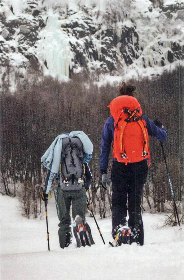 “È una mattina serena grazie al vento freddo che tiene lontane le nuvole, quando partiamo con le ciaspole per le due ore abbondanti di avvicinamento, cercando di capire in che direzione andare, visto che la cascata si intravede solo quando ci si trova direttamente sopra…”.