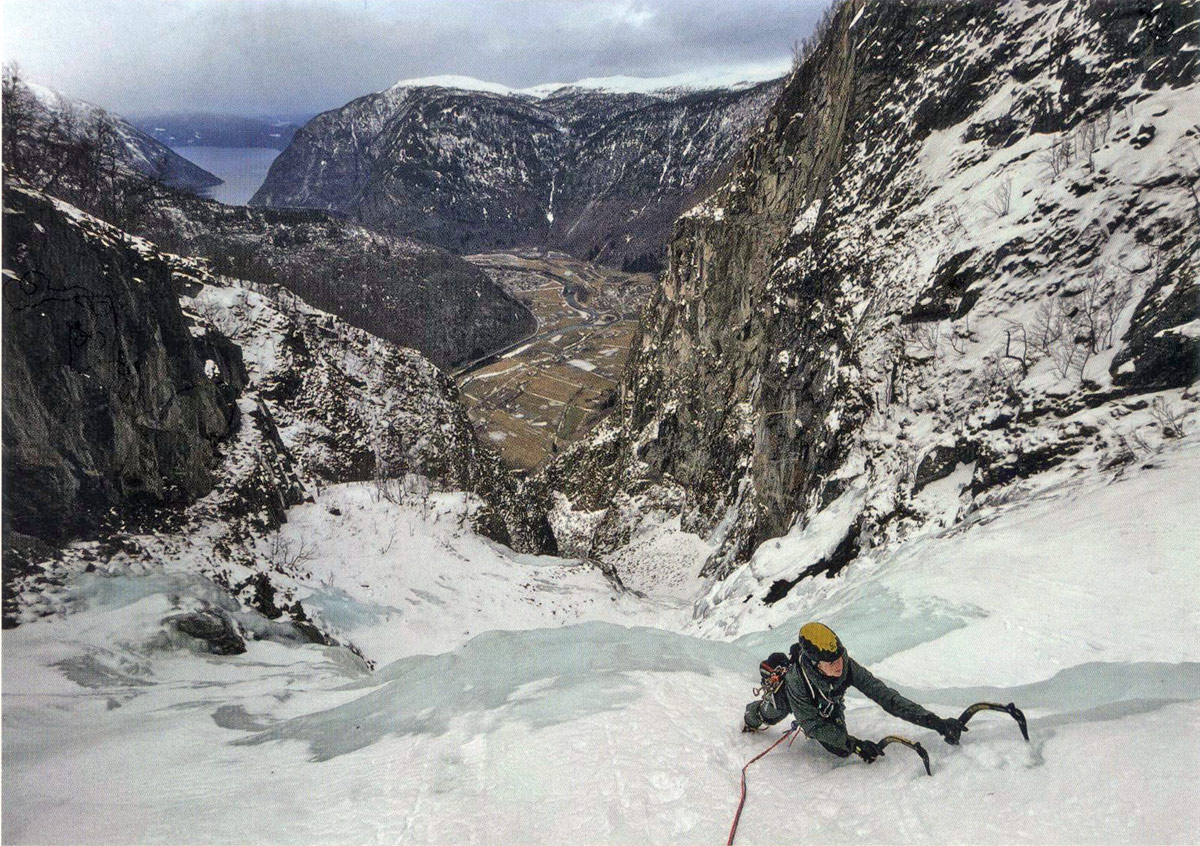 Il giorno seguente partiamo da casa ancora con il buio, diretti verso la cascata di Haugsgjell, una bellissima colata che Martin aveva visto dalla macchina il giorno prima. Situata in cima a una valle laterale di Laerdal, incastonata in un canyon di roccia scura, offre una scalata bellissima in un ambiente impressionante e dal terzo tiro in poi ci regala la vista sul fiordo sullo sfondo. L’avvicinamento di due ore lungo un ripido ghiaione fatto inizialmente di sassi piccoli che diventano massi sempre più grandi man mano che si sale, la scalata di diversi tiri (il primo tiro è di V grado, i successivi leggermente più facili) e infine la discesa lungo il ghiaione con i frontalini, la rendono una di quelle giornate stancanti ma soddisfacenti.
