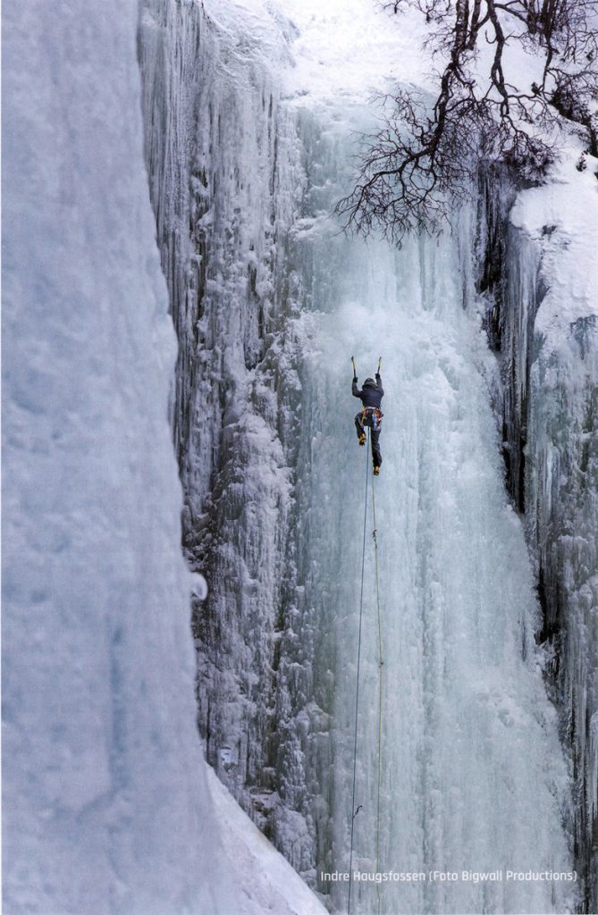 Per il primo giorno scegliamo una scalata con avvicinamento comodo e breve, le due cascate di Haugsfossen. La prima delle due è di IV grado e ci permette di scaldare i motori con due tiri tranquilli, la seconda si può salire in un unico tiro di 60 metri leggermente più verticali. Tra una piccozzata e l’altra, la Norvegia ci dà il benvenuto con qualche fiocco di neve che cade lieve. L’avvicinamento lungo una delle moltissime piste di fondo della zona, seguito da una salita tra gli alberi spogli, ci porta alla bella cascata di Tuvfossen che saliamo in due cordate parallele, vista la sua abbondante larghezza.
