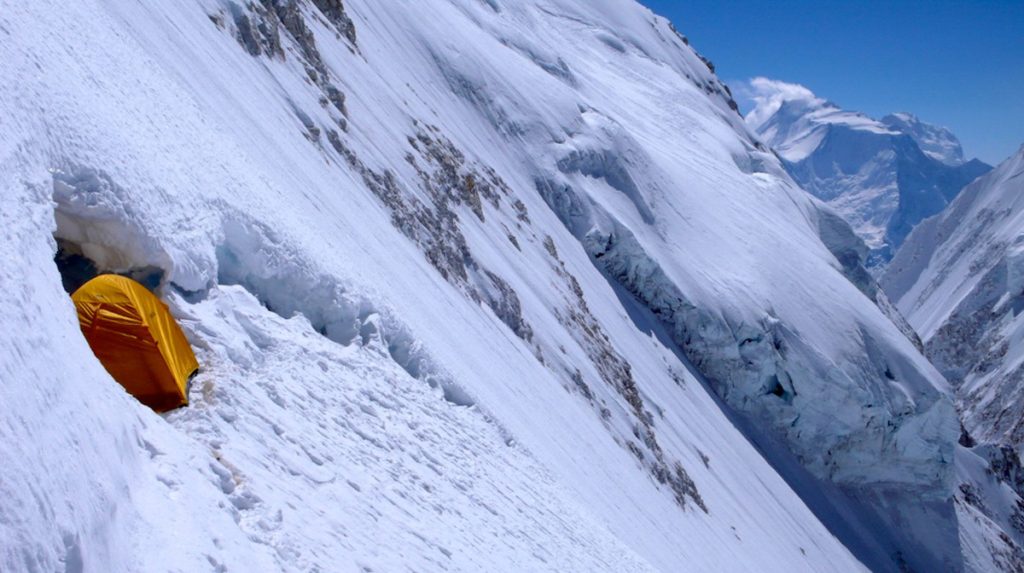 Il sole ha riscaldato la nostra tenda nel tardo pomeriggio e abbiamo riposato i nostri corpi esausti con un pisolino di un’ora. Chang-ho e io abbiamo cucinato il nostro riso liofilizzato e la carne di yak con pasta di fagioli coreana, e ci siamo preparati per la notte mentre le temperature precipitavano. Con un solo saccopiuma da condividere, tremavamo per il disagio mentre il vento infuriava fuori e il gelo ricopriva le sottili pareti della tenda. Eravamo impegnati l’uno con l’altro, con il nostro singolo saccopiuma e con la nostra volontà. Abbiamo cercato di dormire, rannicchiati schiena contro schiena per sfruttare a vicenda il proprio calore, ma invano. Alle 5 del mattino, abbiamo cucinato una zuppa semplice e diviso una barretta di cioccolato per colazione. Lo spazio era limitato, quindi Chang-ho è uscito per prepararsi mentre io mi vestivo pezzo per pezzo dentro.