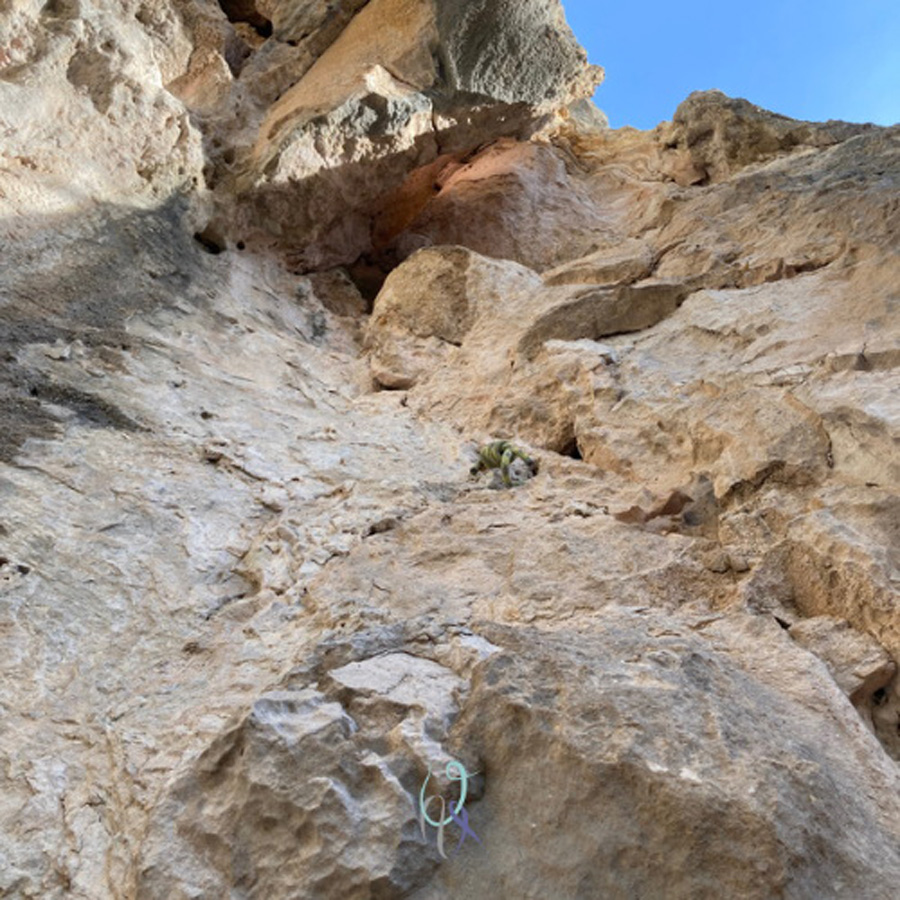 Affascinata da questo quarto tiro, parto entusiasta per il quinto, che trovo molto simile con un passo a mio parere più semplice, ma gradato sempre di VII grado. Anche qui evito una sosta e procedo per un breve tratto verso destra arrivando alla penultima sosta, quella che precede l’ultimo tiro con il passo di 6c. Questa sosta si trova davanti a un’originale (per l’ambiente) piccola grotta che sembra scavata appositamente per ospitare un capitello (o una poltrona per ammirare il panorama, dipende dai punti di vista!). A destra della sosta si erge il breve muro verticale, che sarà indispensabile per appoggiare i piedi quando ci si trova a superare la pancia sopra le nostre teste. Paolo lo supera non senza qualche sospiro. Lo provo anche io e devo dire che dal basso gli appoggi per i piedi sulla parete verticale sembravano abbastanza comodi. Salgo e mi ricredo, in quanto la pancia non mi permette di vedere gli appoggi sotto e sul blocco verticale ogni piccolissima fessura è cosparsa di quella polvere che ti fa pensare “e ora tiene o non tiene?”.