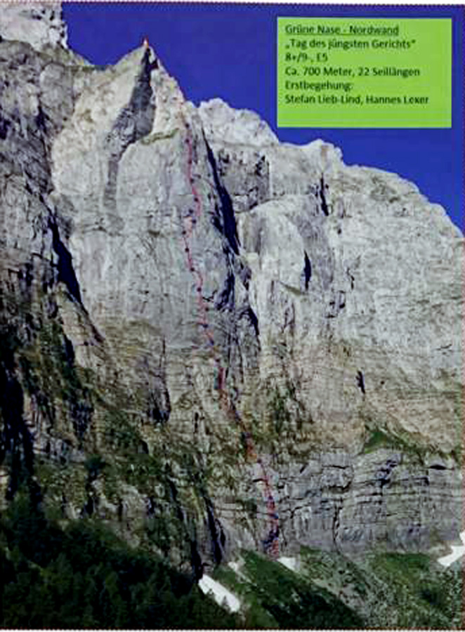«Quanto più alta è la posta in gioco, tanto più soddisfacente è il risultato». Questa «saggezza in realtà banale», che molti conoscono dall’alpinismo, è la conclusione dei due primi scalatori di questa nuova via Tag des jüngsten Gerichts» (Il Giorno del Giudizio, 700 m, VIII+/IX-, E5) sul Grünen Nase della parete nord del Kollin Kofel (Cima di Collinetta) 2238 m, sopra il Passo di Monte Croce Carnico (Plöckenpass).