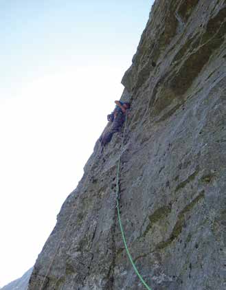 Insieme alle difficoltà di arrampicata piuttosto elevate (le lunghezze più difficili sono infatti le prime tre) e alla scarsa possibilità di assicurazione, soprattutto l’inizio non era proprio allettante alla vista delle numerose lunghezze che ci aspettavano: questo era chiaro dopo una prima ispezione sul posto. Non è che non ci abbiamo provato senza chiodi: anche se Hannes ha iniziato il primo tentativo pienamente motivato e dopo circa 10 metri di altezza è riuscito a fissare un “affidabile” punto di assicurazione intermedio, il resto del percorso sembrava ancora peggiore, con roccia non proprio solida (alla fine abbiamo valutato la lunghezza di 7a con 4 chiodi e un ancoraggio mobile affidabile, un Pecker, a 35 m). Ci abbiamo riflettuto e siamo giunti alla conclusione che senza un minimo di chiodi non si poteva fare. Ma era la linea che ci affascinava.