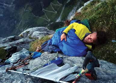 Poiché proprio su questa parete i temporali sono tabù a causa della caduta di sassi e cascate d’acqua, i pochi giorni di piena estate con tempo perfetto sono appena sufficienti. Siamo entrambi padri di famiglia e abbiamo lavori normali, quindi trovare spontaneamente il tempo libero in queste giornate perfette è stata una vera sfida. La chiave del successo quest’anno è stata che, dopo le due estati piovose del 2020 e del 2021, siamo passati allo stile big wall con pernottamento sulla parete (dovevamo infatti raggiungere ogni volta il punto di ritorno dell’ultima volta). Stefan, da vecchio appassionato di arrampicata tecnica, era particolarmente felice di poter finalmente provare di nuovo un po’ di big wall feeling: l’ultima vacanza a Yosemite era stata troppo tempo fa e la prossima, come padre di famiglia, era troppo lontana. Ma perché guardare sempre lontano? Abbiamo quindi allestito due bivacchi sugli unici ripiani della via: uno dopo il 7° tiro (“Hotel zur schönen Aussicht”) e uno dopo il 18° tiro (“Hotel zur schmalen Bettkante”).