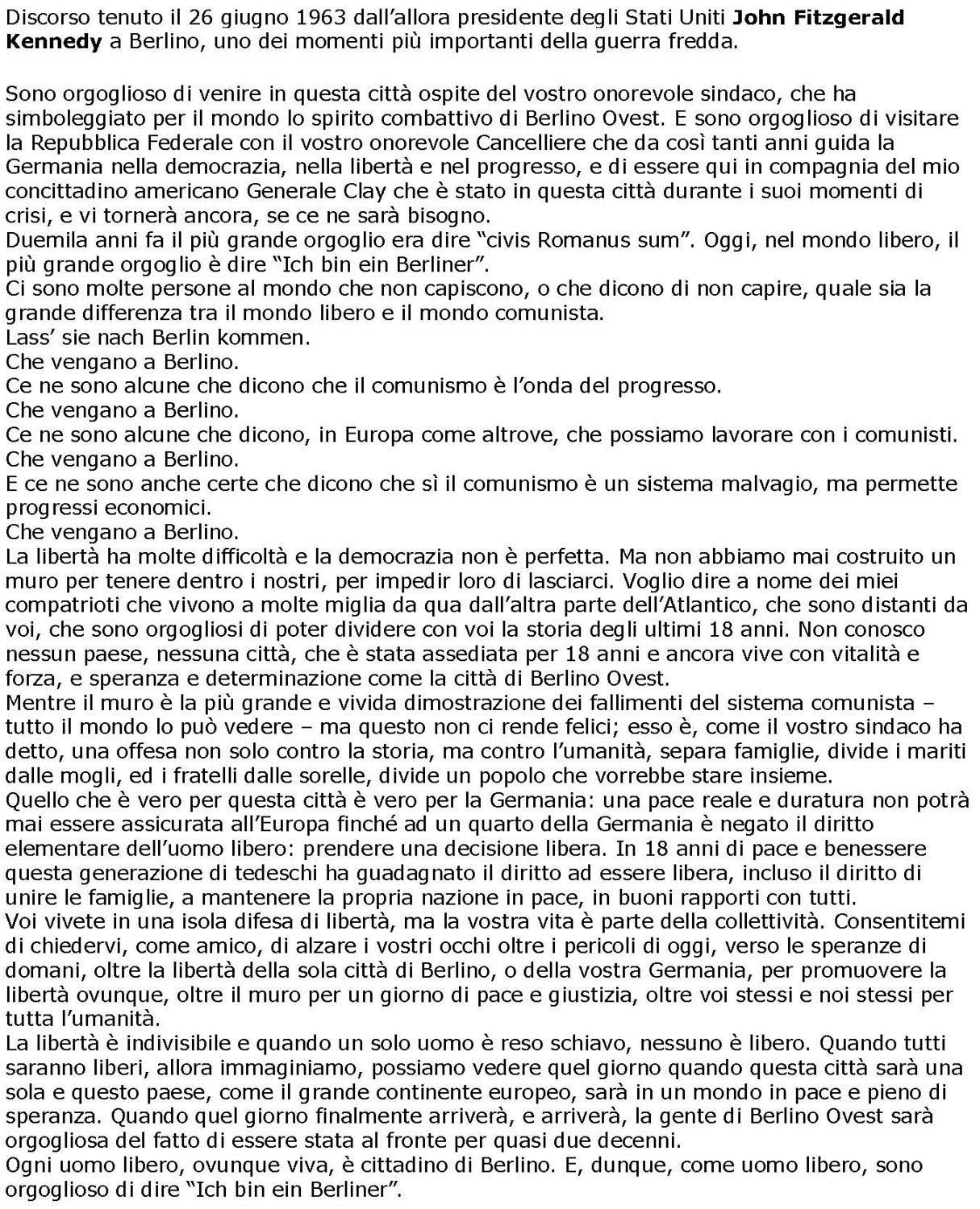 Mi colpì molto la registrazione video (conservata in un museo) del celebre discorso tenuto il 26 giugno 1963 dall’allora presidente degli Stati Uniti John Fitzgerald Kennedy. Carico di pathos e di verità aveva rappresentato uno dei momenti più importanti della guerra fredda. Elena e Petra avevano letto con attenzione le didascalie e conoscevano la situazione di quel momento storico. L’espressione passata alla storia “Ich bin ein Berliner” (io sono un berlinese), con la quale Kennedy aveva ribadito con forza la vicinanza del suo Paese agli abitanti di Berlino Ovest, ci provocò dei brividi.