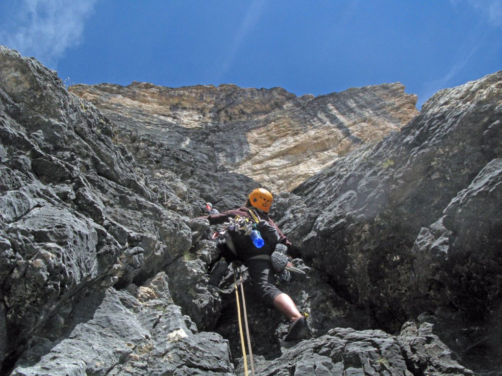 Saliamo qualche lunghezza di corda, davanti a noi sono altri che ogni tanto provocano qualche caduta di sassi. Abbiamo il casco e ci raggomitoliamo per lasciar passare i sassi che cadono. È pericoloso.