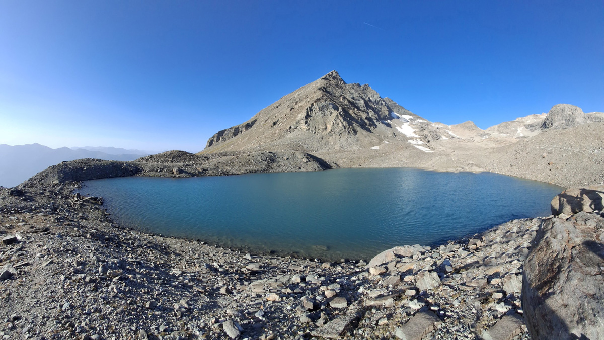 Dopo il pernottamento in questa altra incantevole struttura (18-20 posti), il giorno successivo si punta alla testata del vallone: se ci si tiene a sinistra, si risale su traccia di sentiero in direzione del Colle Inferiore dell’Agnello, collegandosi così all’itinerario già descritto, magari tagliando direttamente verso il ghiacciaio. Se invece si procede diritti nel vallone principale, un po’ su traccia di sentiero e un po’ scarpinando, si raggiunge il bellissimo Lac d’Ambìn (in realtà il toponimo corretto è: Lac du Fond d’Ambìn, ma noi italiani lo chiamiamo Lago d’Ambìn) e da lì si approccia il soprastante Glacier Ferrand.