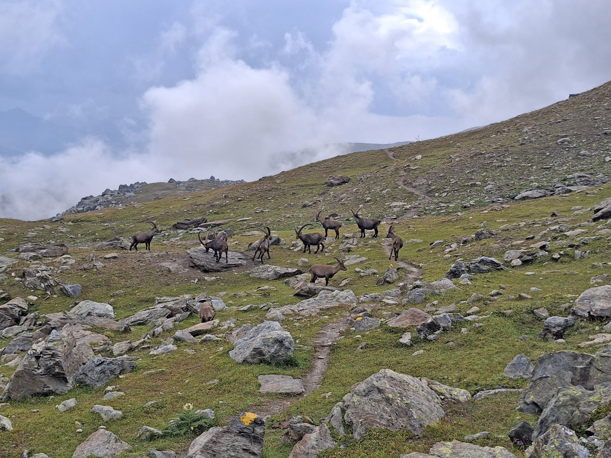 Sulle falde del Niblè-Ferrand si ritrovano invece, sia fra gli umani che fra gli ungulati, quei soggetti in cerca di silenzio e di isolamento. Se mi sdraino sull’erba a una cinquantina di metri dal branco di stambecchi, loro non si preoccupano minimamente di me e continuano placidamente a fare gli affari loro. Posso stare lì ore e nessuno di loro fa una piega.