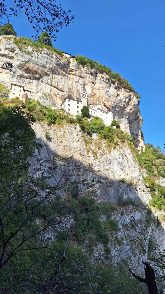 E’ vero per tutti che la fatica della salita svanisce una volta ai piedi di questa chiesa. L’atmosfera è quella consueta dei santuari assai popolari, con il solito bar, i bagni pubblici, il negozio di souvenir e la gente stravaccata. Devo dire però che un tal numero di persone potenzialmente potrebbe essere assai più rumoroso e fastidioso. In generale c’è un certo contegno, anche perché gli altoparlanti stanno diffondendo la Sacra Messa, preghiere mescolate a qualche canto. Leggiamo che questa chiesa fu costruita nel cuore della montagna del Monte Baldo nel ‘500, in sito pressoché inaccessibile a 776 m. La leggenda racconta di un gruppo di locali che vide brillare una luce e sentì un coro angelico provenire dalla parete rocciosa. Poiché il luogo era difficile da raggiungere si calarono con delle corde e lì giunti videro una statua raffigurante la Pietà, proprio sull’orlo dell’anfratto roccioso. Sempre la leggenda vuole che questa sarebbe stata originariamente custodita nell’isola di Rodi. E che, appunto per sfuggire all’invasione dei turchi di Solimano II e ai saccheggiamenti dei tesori dell’isola, grazie ad un intervento angelico sia stata trasferita sul Monte Baldo.