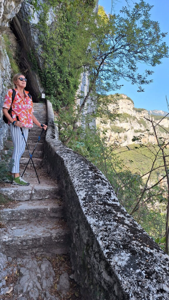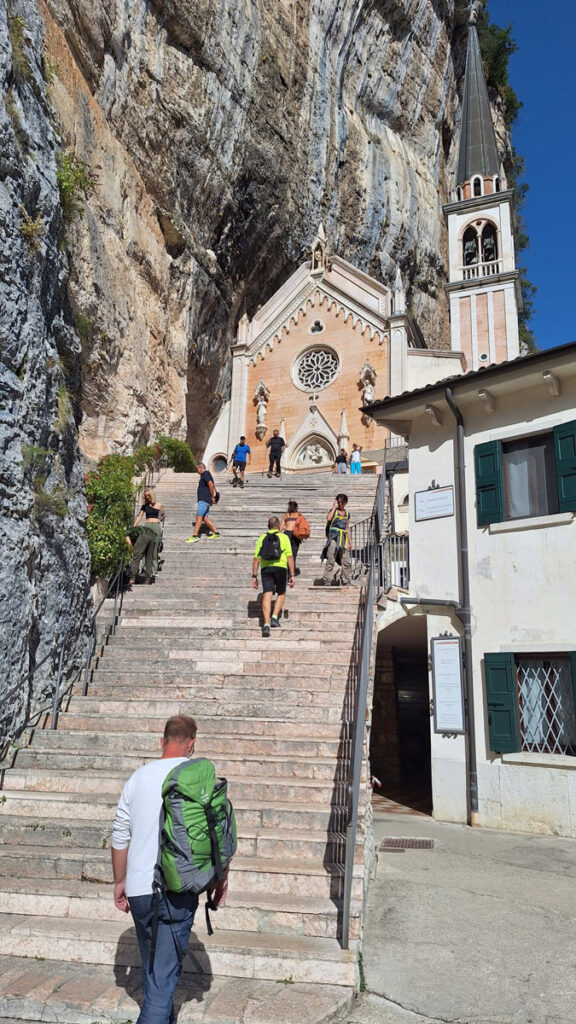 Si incomincia a intravvedere la grandiosità del profondo solco roccioso del Vajo dell’Orso, che s’inoltra nel pieno del massiccio del Monte Baldo. Dopo un lungo traverso ascendente si arriva sotto una falesia di roccia che sembra preludere ogni continuazione. Qui i costruttori del sentiero, secoli fa, hanno dato il massimo, scavando nella viva roccia una gradinata, protetta da un muretto, che sale a zig-zag. Passiamo da una piccola cavità che prende il nome di Grotta della Pietà e diamo un occhio al libro del pellegrino con tutte le firme delle persone che sono passate prima di noi. Non lo firmiamo e, un po’ oltre alla fine di questa scalinata davvero pazzesca, riusciamo finalmente a vedere, incastonato in una grande falesia verticale, il Santuario della Madonna della Corona.