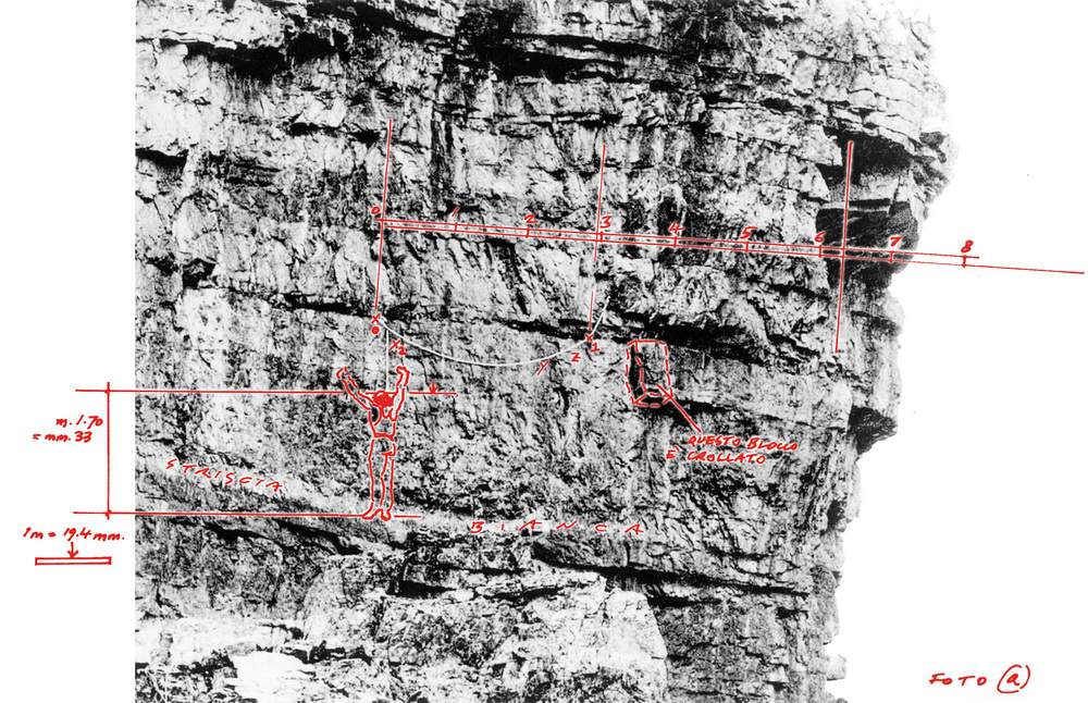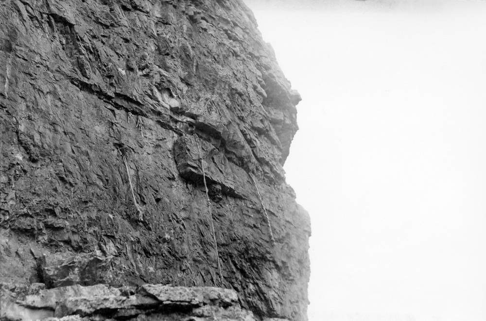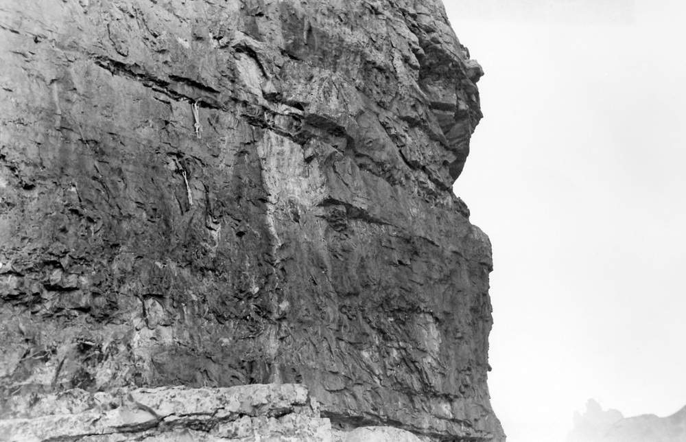 Foto eseguita il 17 settembre 1950 dove si vede, al centro e sotto la fessura orizzontale, la traccia lasciata dal grosso blocco di roccia franato. Levento è dunque avvenuto nei giorni tra il 17 luglio e il 16 settembre 1950. Foto: Severino Casara