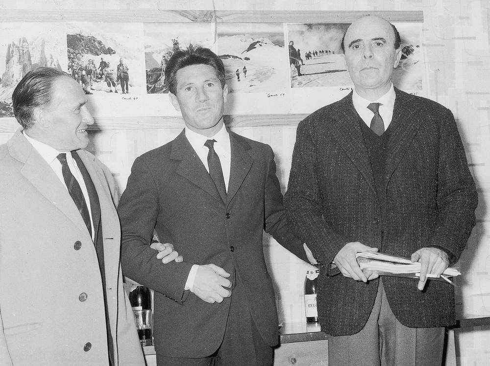 Gino Soldà (a sinistra), Walter Bonatti e Severino Casara, Schio, 18 aprile 1962