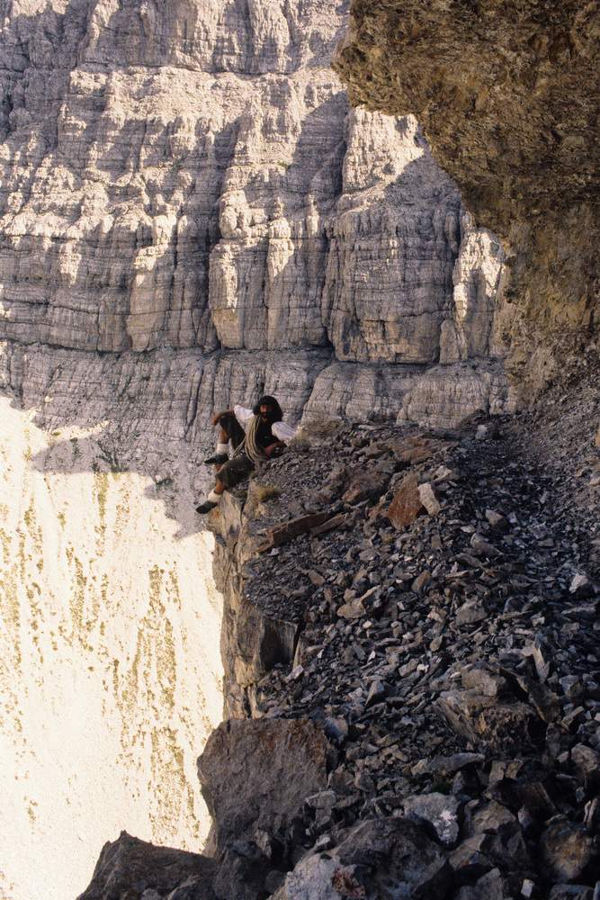 Mauro Corona, vestito da scalatore dell’inizio del secolo scorso, sul ballatoio della discesa Piaz del Campanile di Val Montanaia