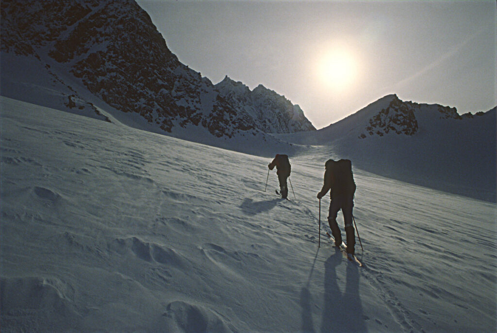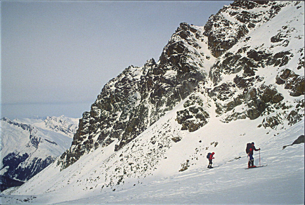 Il giorno dopo era freddo e grigio, ma ugualmente col Pestalozza ci alzammo presto per fare un’escursione con gli sci. La zona prescelta riguardava la guida che stavo facendo con Angelo per la Collana Monti d’Italia, così anche lui si aggregò, forte della maggiore conoscenza dei luoghi. Salimmo da Splugen al Colletto 2790 m del Mittler Schwarzhorn 2838 m (gruppo del Suretta), scendendo poi sul versante opposto verso il Passo dello Spluga e quindi ancora all’auto.