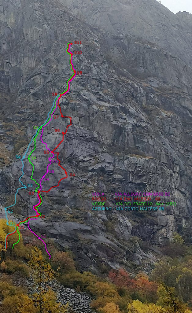 Al ritorno dal viaggio in Cambogia a fine gennaio 2017, di cui racconto in Metadiario-294, potei finalmente andare a ritirare la mia nuova Volvo V40 T4 che avevo ordinato secondo la formula del noleggio a lungo termine e che mi era stata resa disponibile in mia assenza. L’anno 2017 ha però segnato, già da febbraio, la ripresa dei miei dolori via via in crescendo. A dispetto di ciò, feci qualche bella arrampicata un po’ ovunque (come mio solito) nell’Italia Settentrionale, dal Piemonte alla Liguria, dal Trentino (Valle del Sarca) al Lecchese e alla Valchiavenna, dalla Val d’Ossola a Brentino (Val d’Adige). Qui citerò solo la Via del Fratello (9 lunghezze), il 20 maggio, sulla parete di Alpherian nel Vallone di Forzo. Ero con Matteo Pellegrini, Valeria De Vecchi, Giovanni Sicola e due ragazze, Maria Teresa ed Emilia.
