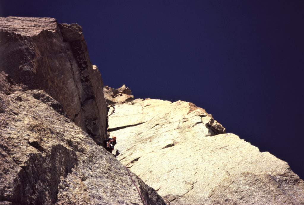 Verso sera usciamo sulla spalla del pilastro dove avevamo previsto di bivaccare. Questo primo successo non elimina però tutti i dubbi sull’esito finale della nostra salita; sopra di noi lo spigolo è monolitico e a un primo esame non lascia intravvedere punti deboli.