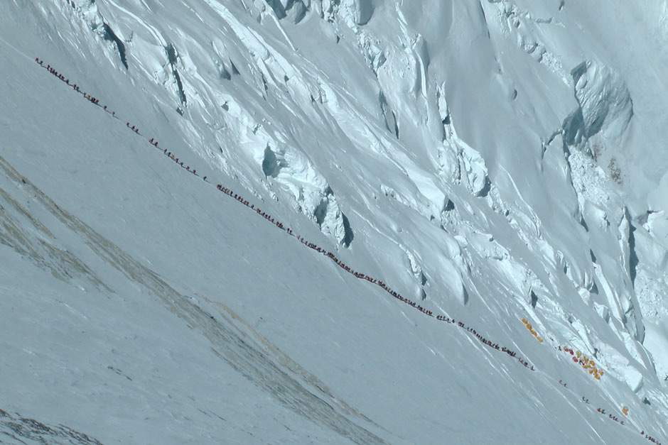 Famosa foto (2013) della colonna di aspiranti summiters all’Everest. Foto: Ralf Dujmovits