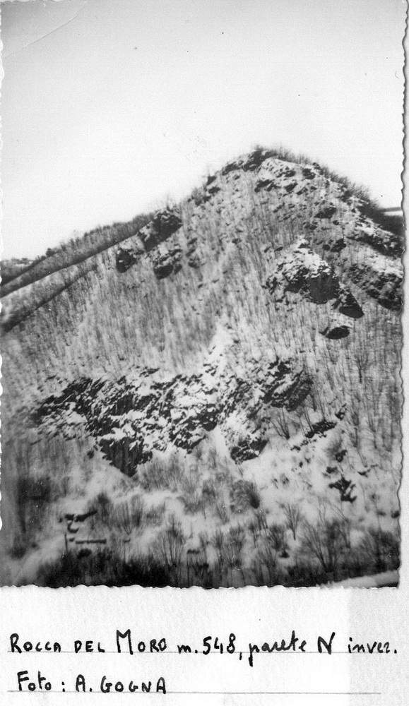 Oggi è sabato. Non sono libero prima delle 16.30, e partiamo a quell’ora con Giovanni e la sua ‘600. Presto siamo a Busalla, poi Borgo Fornari e la Castagnola. Fotografo la Rocca del Moro, tutta innevata, di pietra verde di Polcevera, una roccia durissima. Dalla Castagnola, sempre in auto, fino a quasi 300 m da Fraconalto. La parete sud-ovest ci incombe in testa. Lasciamo a destra la verticale parete sud-sud-est e tiriamo su, nel punto in cui la parete arriva più in basso, un po’ sulla sinistra. Non c’è una via davvero obbligata su questa settantina di metri, l’arrampicata consiste nell’evitare più marciume che si può, con difficoltà di III e III+. Dopo, c’è la paretina di destra, che noi abbiamo preso per lo spigoletto di destra (facilmente evitabile, se si vuole, a destra per una cengia), marcio e molto esposto, di IV+. E si è in vetta. Traversata verso l’altra cima a nord. Ultimo passo di IV- su roccia buona. Poi, ormai al buio, scendiamo all’auto, per un canalino pieno di neve. Scabbia arrampica bene, sebbene sia per lui la prima volta: senza dubbio sarà uno dei migliori del corso.