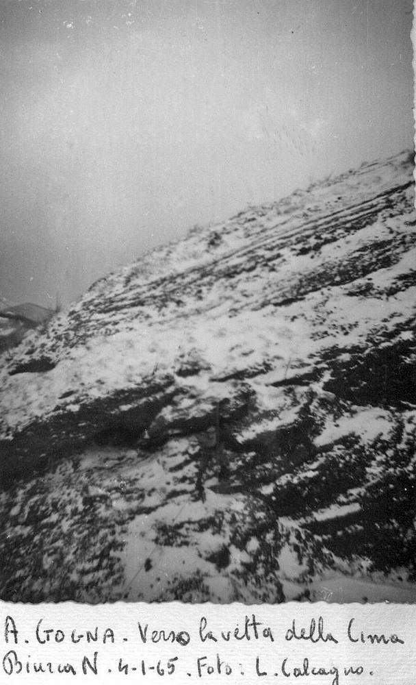 4 gennaio 1965. Ha nevicato da poco. Al di là dell’Appennino tutto è pieno di neve, ma in alto ce n’è un po’ meno. Siamo male intenzionati, Lino Calcagno ed io, verso lo spigolo della Biurca. Sono le 7.15 ed è ancora un po’ buio.