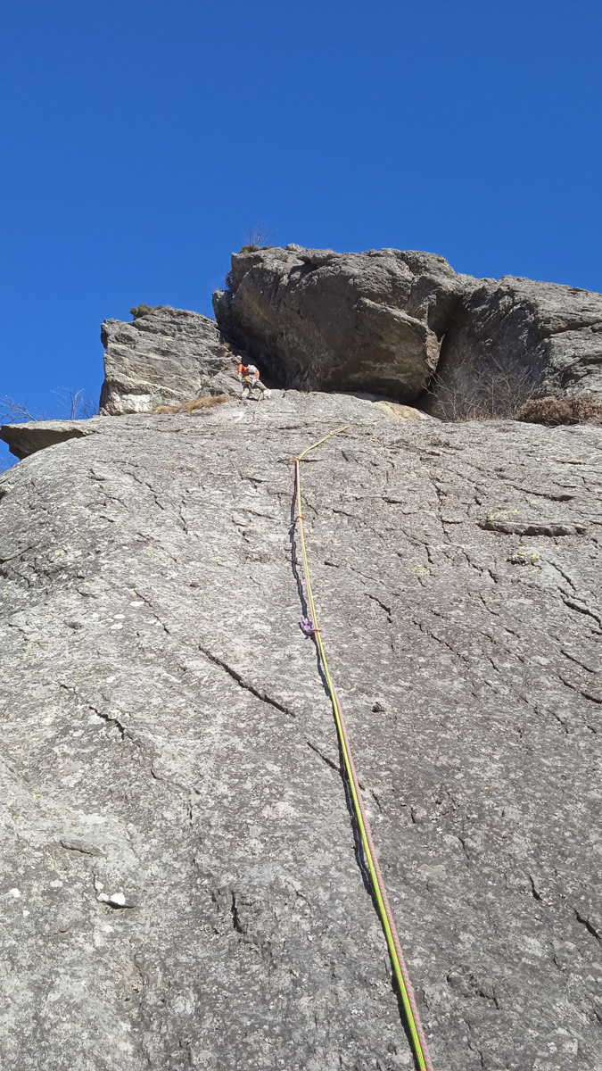 Torniamo dopo qualche settimana… stavolta attacca Lorenzo con un tiro di placca abbastanza semplice, poi tocca a me su una placca impegnativa, per fortuna sono placchista, e dopo un ultimo pilastrino faccio sosta: è il quarto tiro. Riparte Lorenzo, la scelta è fra un muro aggettante a sinistra e un camino a destra, ma abbiamo deciso che vogliamo chiodare una via divertente, e dunque infiliamoci nel camino! E così arriviamo al sesto tiro, una serie di strapiombini e magnifiche placchette a bugnoni; intanto ci siamo spostati sulla faccia ovest della parete, è tardi e decidiamo di scendere.